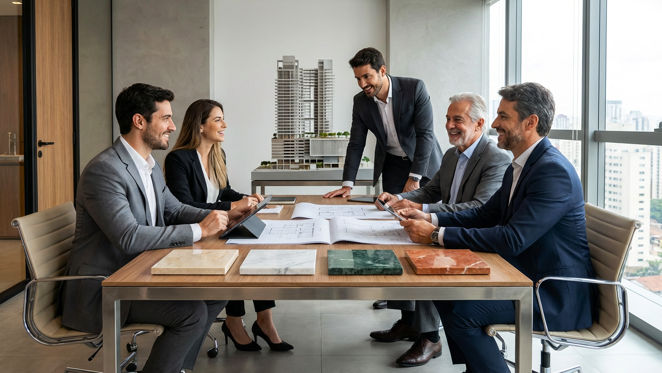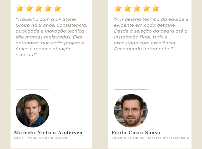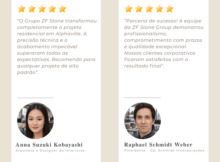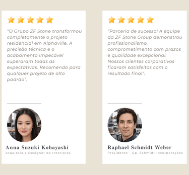 "Confiabilidade total. A ZF Stone Group é nosso parceiro preferido para projetos de luxo. Suas soluções técnicas, consultoria e gestão estratégica de obra são impecáveis."